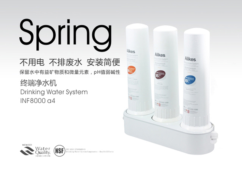 Alikes終端凈水機利用市政管道自來水的壓力驅(qū)動水流,通過獨特的濾芯來達到生飲的標準。去除水中的泥沙、******、鐵銹、懸浮物、有害重金屬、余氯異色和異味。不需用電,不產(chǎn)生廢水,即用即飲,不需儲水罐避免二次污染 , 確保飲水健康。是凈水機中的高端產(chǎn)品,適用于別墅、******商務(wù)樓、******住宅樓。滿足高端人群對高品質(zhì)飲水的需求 。